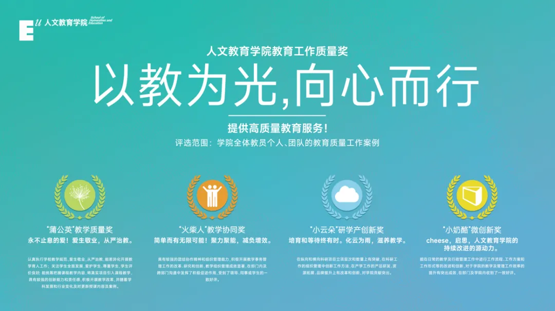 9月10日下午,在第41個(gè)教師節(jié)到來(lái)之際,人文教育學(xué)院以“以教為光,向心而行”為主題,舉行2025年教育工作質(zhì)量獎(jiǎng)表彰大會(huì),表彰在過(guò)去的一學(xué)年中,在教育教學(xué)、協(xié)同管理、研學(xué)創(chuàng)新等方面涌現(xiàn)出的優(yōu)秀個(gè)人與團(tuán)隊(duì),進(jìn)一步激發(fā)全院教職工投身高質(zhì)量教育服務(wù)的熱情,凝聚全院力量推進(jìn)師范專業(yè)建設(shè)再上新臺(tái)階?!捌压ⅰ保簣?jiān)守教學(xué)初心,深耕課堂質(zhì)量“蒲公英”教學(xué)質(zhì)量獎(jiǎng)以“永不止息的愛(ài)!愛(ài)生敬業(yè),從嚴(yán)治教”為理念,表彰在教學(xué)規(guī)范、...