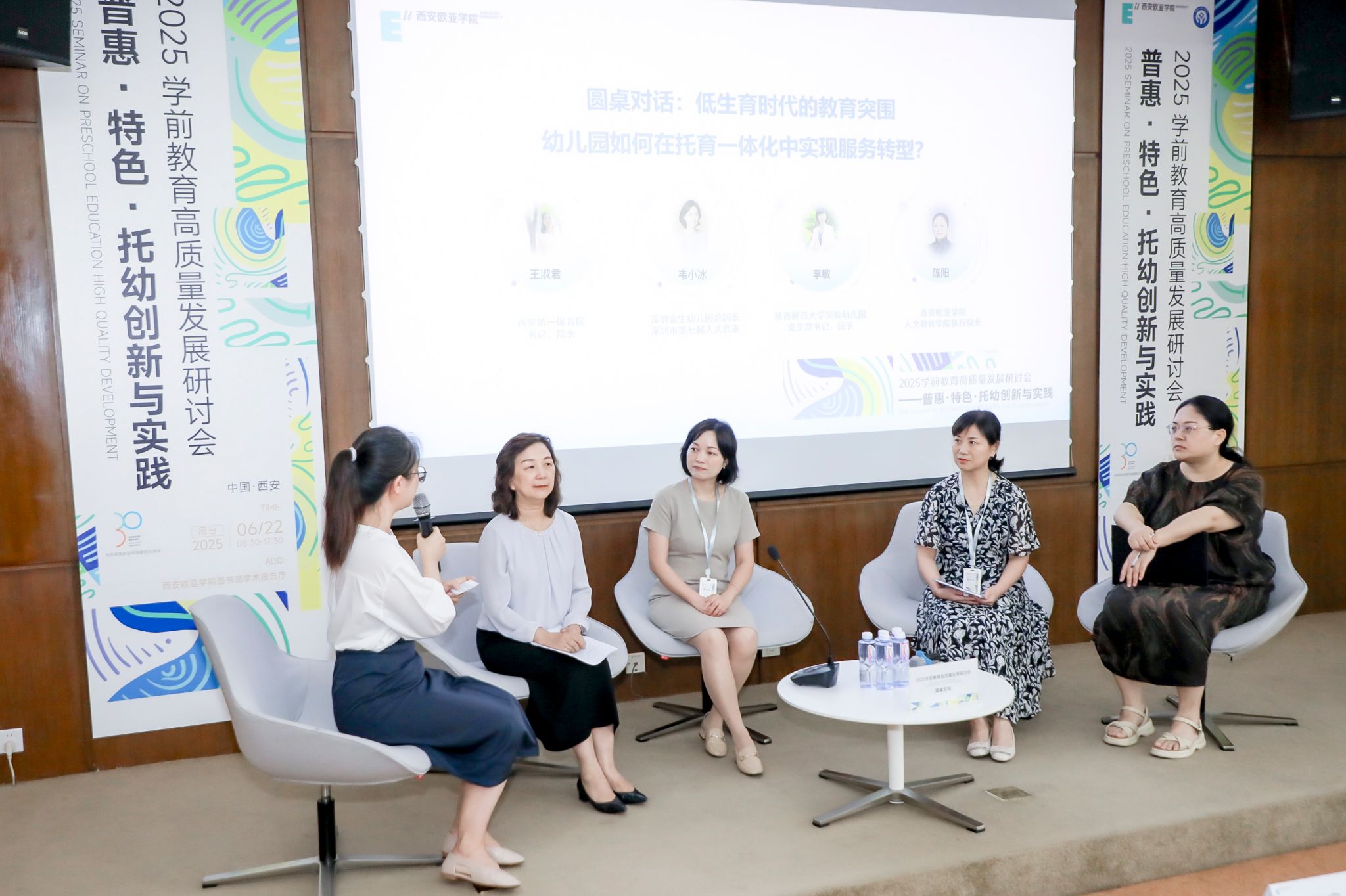 上半場(chǎng)與會(huì)嘉賓圍繞“低生育時(shí)代的教育突圍:幼兒園如何在托幼一體化中實(shí)現(xiàn)服務(wù)轉(zhuǎn)型”展開(kāi)了深入討論。西安市第一保育院的王淑君園長(zhǎng)、深圳新生幼兒園的韋小冰園長(zhǎng)、陜西師范大學(xué)實(shí)驗(yàn)幼兒園的李敏園長(zhǎng)以及西安歐亞人文教育學(xué)院陳陽(yáng)院長(zhǎng)分別從政策準(zhǔn)備、課程體系構(gòu)建、師資培養(yǎng)等角度分享了各自的觀點(diǎn)和實(shí)踐經(jīng)驗(yàn)。
