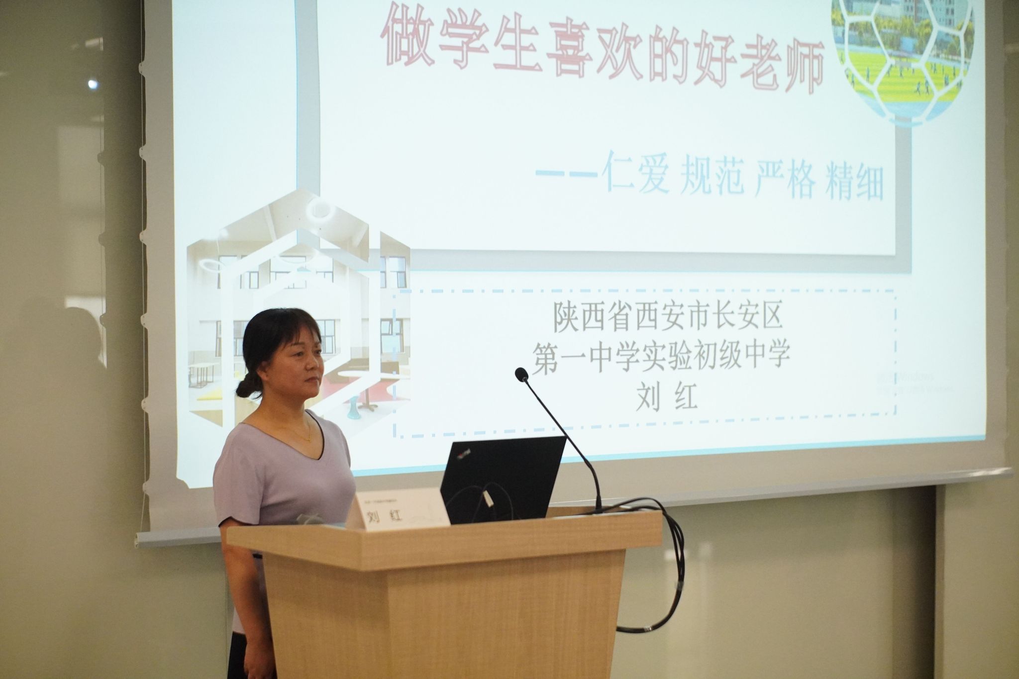 西安市長安區(qū)第一中學(xué)實(shí)驗(yàn)中學(xué)副校長、高級(jí)政治教師、長安區(qū)師德標(biāo)兵、長安區(qū)首批名師、西安市師德先進(jìn)個(gè)人、西安市年度教育人物、西安市學(xué)科帶頭人、西安市模范教師、陜西省優(yōu)秀教師、陜西省教學(xué)能手、陜西省學(xué)科帶頭人劉紅以《做學(xué)生喜歡的好老師》為主題,結(jié)合自己的成長經(jīng)歷及感悟,從教師專業(yè)成長及學(xué)生管理兩個(gè)方面通過講故事的方式,引導(dǎo)教師們?cè)诮逃虒W(xué)過程中依法依規(guī),堅(jiān)持仁愛、規(guī)范、嚴(yán)格、精細(xì)的管理方式,踐行教育家精神,做學(xué)生喜歡的好老師。