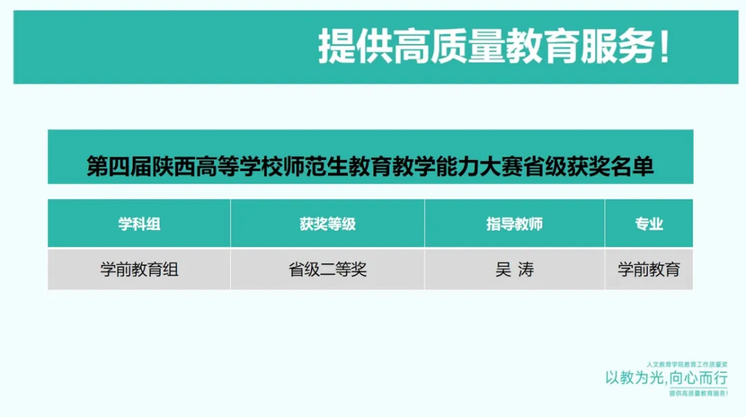 英語專業(yè)中國文化課程小組(謝長菊、白瑞芳、鄭分、成鳳蓮、薛雯、高宇婷、劉奕鷦)創(chuàng)新融合本土文化與英語教學,依托“文淵社”與“歐二代”項目構(gòu)建“線上+線下”混合教學體系,實現(xiàn)課程跨校輻射;學前教育專業(yè)藝術(shù)理論與實踐課程組(于瑞華、牛曉牧、李洋、趙文琪、馬克偉、范榮超、鄭嘉寶、蔡娜)推動美育全覆蓋,策劃“解字”主題課程展,并指導學生榮獲“華文杯”全國師范生教學技能大賽二等獎,充分彰顯師范認證導向下的實踐育人成效;劉曉倩老師在課程教學中引入真實課題,并創(chuàng)新地進行場館與研學真實環(huán)境授課,增加學生的行業(yè)感受,指導學生進行課程實踐,承接西影集體研學項目、服務區(qū)域小學,將認證要求的“行業(yè)實踐融入教學過程”落到實處,獲得行業(yè)和用戶好評;賀甜甜老師主持校級教改重點項目,參照“跨學科整合”的認證標準建立教學案例庫,開發(fā)在線課程輻射38所院校;蔡娜老師持續(xù)改革《舞蹈基礎》課程,踐行“成果導向”的認證要求,在兼顧學生課程學習成效的同時,注重成果產(chǎn)出,共計帶領(lǐng)77名學生獲得獎項,獲評為“蒲公英”教學質(zhì)量獎。