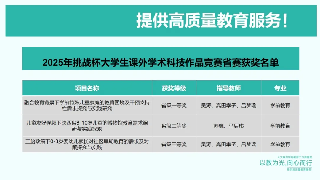 學科競賽方面,學院教師團隊表現(xiàn)優(yōu)異:在中國國際大學生創(chuàng)新大賽、挑戰(zhàn)杯省賽、陜西高等學校師范生教育教學能力大賽中,獲得省級金獎、一等獎等多項榮譽,充分體現(xiàn)了過去一年的育人成效。