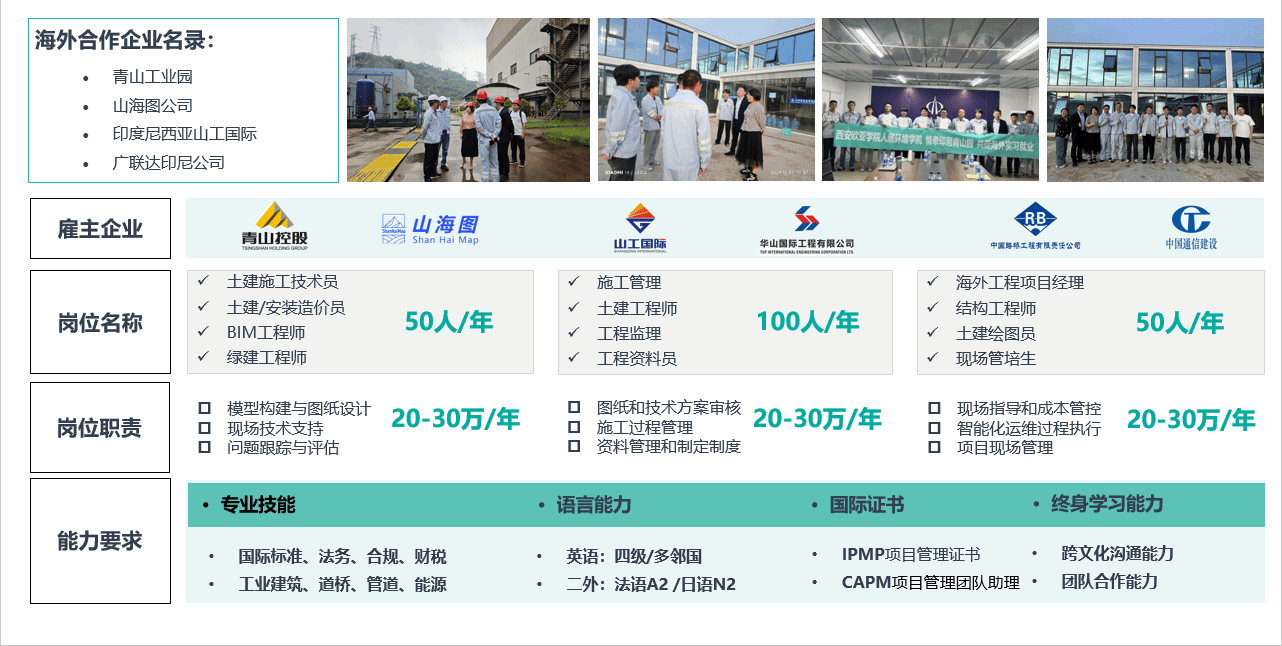 在東南亞國家,歐亞與山海圖(跨國綜合性咨詢企業(yè))、山工國際(跨國建筑企業(yè))合作,依托其覆蓋2000余家出海企業(yè)的資源網(wǎng)絡,為學生在基建、IT、零售等領域匹配25-35萬年薪的優(yōu)質崗位,并配套印尼語等小語種培訓,實現(xiàn)從校園到海外職場的自然對接。