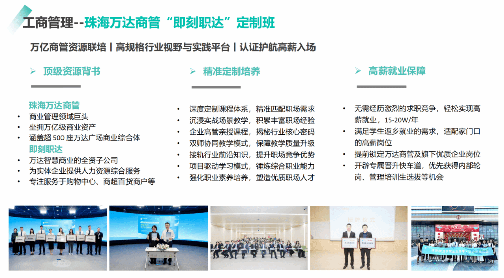 工商管理專業(yè)與珠海萬達(dá)商管共創(chuàng)“即刻職達(dá)”定制班(隸屬于工商管理專業(yè)),依托其豐富的行業(yè)資源與全球先進(jìn)的管理經(jīng)驗,為學(xué)生提供充滿可能性的學(xué)習(xí)與實踐平臺。作為萬達(dá)智慧商業(yè)的全資子公司,“即刻職達(dá)”深度參與課程建設(shè),采用“深度定制課程+沉浸實戰(zhàn)場景”的教學(xué)模式,幫助學(xué)生更好地理解現(xiàn)代商業(yè)綜合體的運營管理。