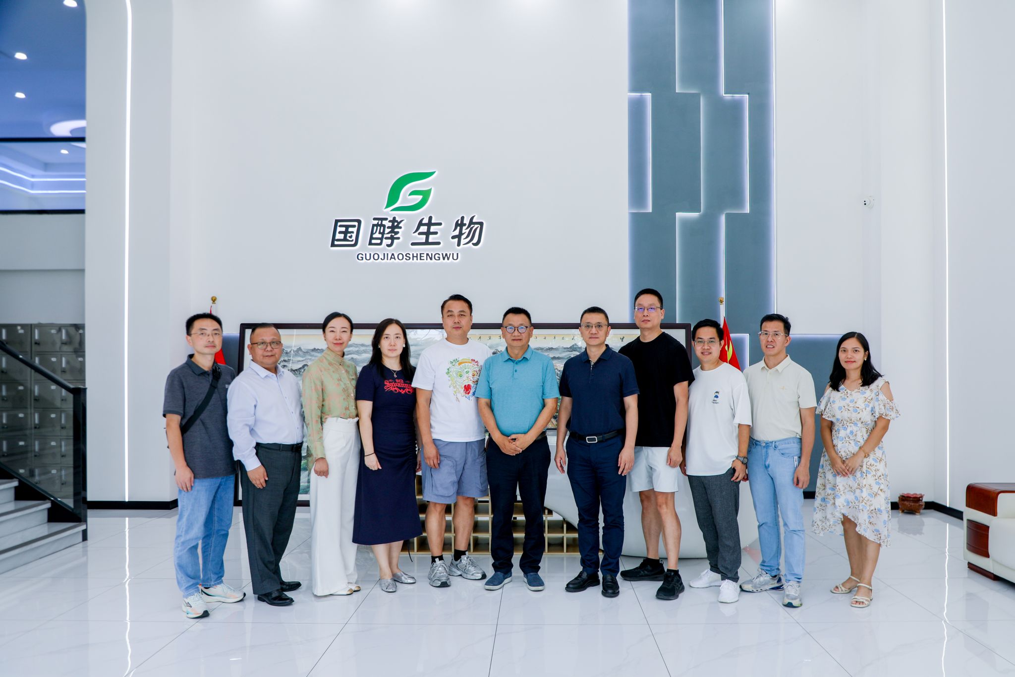 胡建波一行走訪梁華(左五)在佛山創(chuàng)立的國(guó)酵生物(廣東)有限公司