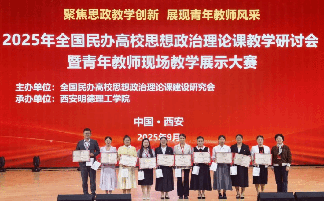2025年9月21日,由全國民辦高校思想政治理論課建設研究會主辦的全國民辦高校思想政治理論課教學研討會暨青年教師教學展示大賽在西安隆重舉行,西安歐亞學院馬克思主義學院的劉應清老師憑借深厚的理論功底、創(chuàng)新的教學設計和生動的課堂表現(xiàn),從眾多參賽選手中脫穎而出,榮獲一等獎。