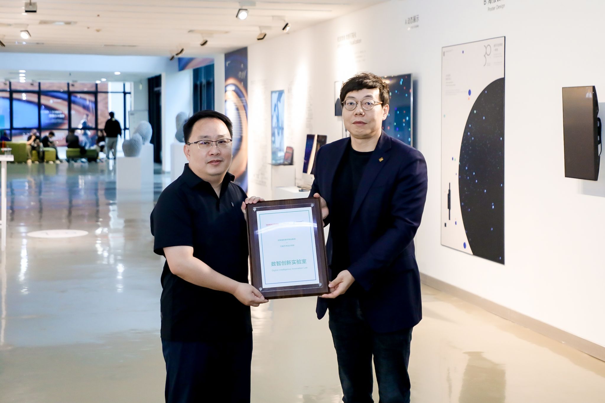 西安歐亞學(xué)院李正副校長與楊昌源博士為“數(shù)智創(chuàng)新實驗室”共同授牌