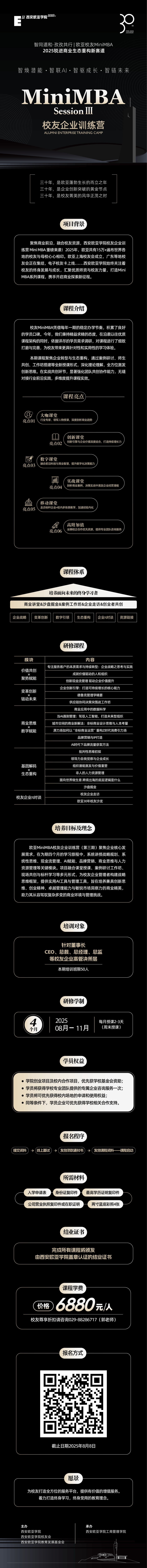 2025年8月至11月,西安歐亞學(xué)院Mini MBA校友企業(yè)訓(xùn)練營第三期即將重磅來襲,本期訓(xùn)練營繼續(xù)優(yōu)化師資與課程內(nèi)容,為校友們帶來更優(yōu)質(zhì)的思想交流與實(shí)戰(zhàn)指導(dǎo),直擊企業(yè)發(fā)展關(guān)鍵,課程學(xué)員現(xiàn)開始招募!