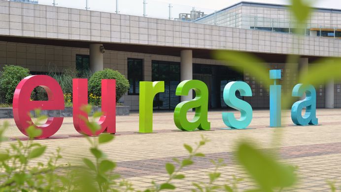 大學(xué)生活動中心于2013年啟用,為了不對后方景色形成遮擋,遂將其設(shè)計成下沉式建筑?!按蠡睢眱?nèi)設(shè)形體訓(xùn)練室、多功能排練廳、聲樂訓(xùn)練室、話劇排練室等等,以滿足歐亞學(xué)子的社團活動需求,公共區(qū)域和會議室則多用于舉辦展覽,沙龍、講座等。先進的活動設(shè)施,完備的音響等設(shè)備,暖色調(diào)的墻面和燈光,讓每一位參與者都擁有置身藝術(shù)空間的既視感。