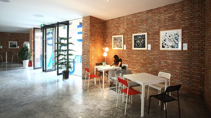 北區(qū)學(xué)生客廳于2015年10月落成,是在舊有的男生公寓樓之間,通過連廊、大廳等形成了兩個各1500㎡的類似酒店大堂的庭院建筑,在設(shè)計(jì)之初,亦突出建筑的節(jié)能環(huán)保,客廳空間由紅磚、清水混凝土砌筑而成,走廊引入自然光照明。“客廳”內(nèi)設(shè)學(xué)習(xí)中心、服務(wù)中心、健身房、瑜伽室、洗衣房、浴室、便利店、心理咨詢室、情緒宣泄室等20多個不同的功能空間,滿足了學(xué)生學(xué)習(xí)生活多方面的需求。