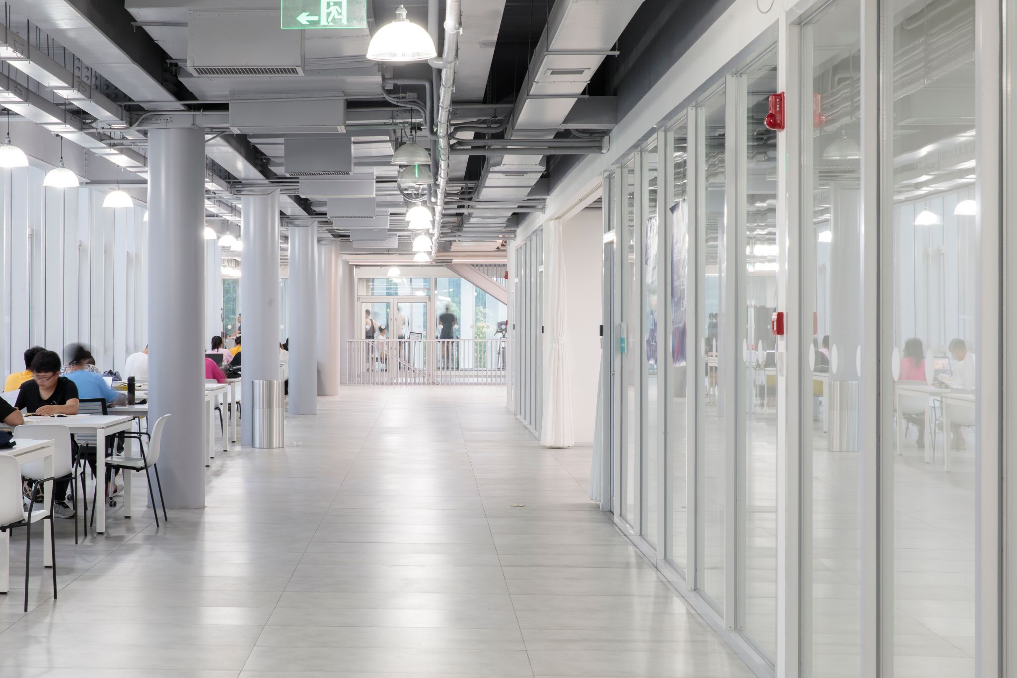 通廊集合了交通、導(dǎo)向、游憩等功能,高效地將公共空間整合在一起,高效覆蓋南區(qū)、西區(qū)學(xué)生的學(xué)習(xí)、生活需求。
